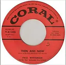 "Then and Now" was recorded on December 7, 1954, and released in 1955 on Coral Records, was composed by Paul Whiteman with Dick Jacobs and Bob Merrill.[1] The song was released as a 45 rpm single in 1955 as Coral 61336 backed with "Mississippi Mud" by Paul Whiteman and His New Ambassador Orchestra with the New Rhythm Boys.