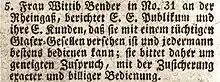 The enterprising Sara Bender continued her husband's glazier business thanks to a special permit. In August 1818 she married master glazier Adam Uehlinger, had two more children, died on 26 June 1839 at the age of 55 and left behind a considerable fortune of almost 20'000 francs.[24]