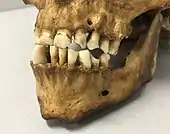 Theo's teeth were badly affected by tooth decay or had died off. Apart from that, the aforementioned oval gaps on the left side of the dentition are remarkable, as they almost form a circular cross-section when the jaw is slightly opened. Examinations with a scanning electron microscope showed fine scratch marks on the tooth surface, indicating a wear process caused by the ceramic mouthpiece of a clay pipe and the fine quartz grains contained therein.[12]