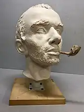 In the year 2001, historian Fabian Link created a facial reconstruction of Theo under the guidance of anthropologist and sculptor Gyula Skultéty. Link portrayed him as a 40-year-old man with wrinkles and a face marked by years of hard work. Later, more detailed investigations into Theo's age of death revealed that he died at the age of 30. With the new information, Gyula Skultéty portrayed Theo as a younger man.[25] The reconstruction thus shows a plausible variant of Theo's appearance at the time of his death.