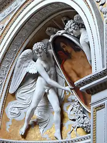 Originally the chapel was called Santa Caterina «del Calice» or «del Cadice» to distinguish it from the Chapel of Santa Caterina «del Portogallo» in the right aisle. There are stucco chalices with ribbons and vases on the spandrels and the statue of Saint Catherine was holding up an antique chalice at least until the first quarter of 18th century (it was definitely missing at the time of the apostolic visitation in 1824 and later replaced by a bronze palm). The symbol of the chalice alluded to the city of Cádiz and the bishopric - although it can be noted that Girolamo Theodoli never set foot in Spain. In 1564 he was forced to resign because his long absence made his position untenable but at the same time he obtained a generous annual income of 3000 scudi.[1] This certainly helped him to acquire and decorate a chapel in the prestigious basilica of Santa Maria del Popolo a few years later.