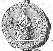 The identity of Leopold VI's wife has long been disputed by scholars. The medieval sources only recorded her name, Theodora, and that she was the granddaughter of a Byzantine emperor (Theodoram neptam regis Graecorum duxit uxorem, Theodoram neptem regis Grecie).[1] Modern scholars, beginning with Georg Juritsch in 1894, have offered different opinions on who that emperor was, with some considering Theodora the granddaughter of Isaac II Angelos (r. 1185–1195, 1203–1204), while others held that it was Alexios III Angelos (r. 1195–1203).[2] Still others interpreted the neptis not as granddaughter as in Classical Latin, but as niece, or even great-niece, which was the more common meaning of the word in the Middle Ages.[3]
