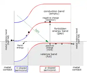 The voltage measured is equal to the difference in the quasi Fermi levels of the majority carriers (electrons in the n-type portion and holes in the p-type portion) at the two terminals.[3]