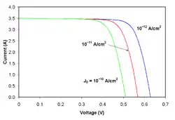 Thus, an increase in I0 produces a reduction in VOC proportional to the inverse of the logarithm of the increase. This explains mathematically the reason for the reduction in VOC that accompanies increases in temperature described above. The effect of reverse saturation current on the I-V curve of a crystalline silicon solar cell are shown in the figure to the right. Physically, reverse saturation current is a measure of the "leakage" of carriers across the p-n junction in reverse bias. This leakage is a result of carrier recombination in the neutral regions on either side of the junction.
