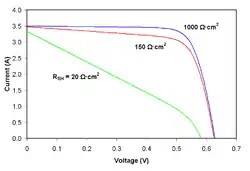 As shunt resistance decreases, the current diverted through the shunt resistor increases for a given level of junction voltage. The result is that the voltage-controlled portion of the I-V curve begins to sag far from the origin, producing a significant decrease in the terminal current I and a slight reduction in VOC. Very low values of RSH will produce a significant reduction in VOC. Much as in the case of a high series resistance, a badly shunted solar cell will take on operating characteristics similar to those of a resistor. These effects are shown for crystalline silicon solar cells in the I-V curves displayed in the figure to the right.