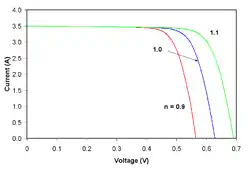 Most solar cells, which are quite large compared to conventional diodes, well approximate an infinite plane and will usually exhibit near-ideal behavior under standard test conditions (n ≈ 1). Under certain operating conditions, however, device operation may be dominated by recombination in the space-charge region. This is characterized by a significant increase in I0 as well as an increase in ideality factor to n ≈ 2. The latter tends to increase solar cell output voltage while the former acts to erode it. The net effect, therefore, is a combination of the increase in voltage shown for increasing n in the figure to the right and the decrease in voltage shown for increasing I0 in the figure above. Typically, I0 is the more significant factor and the result is a reduction in voltage.