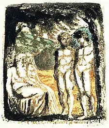 | Plate a1 (frontispiece) | ![]() | The Author & Printer W Blake | On the right, two young men, both naked, stand by a tree. The man farthest to the left holds a shepherd's crook in his right hand. On the left is seated an elderly couple, both wearing gowns. Another tree can be seen on the left margin, with its branches forming a canopy over the couple. In the distance, mountains are visible. | From Copy G. In the six known original impressions of this plate, "The Author & Printer W Blake" has been printed at the bottom of the page, but in Copy G, the text has been obscured by wash. Also, in all six impressions, the phrase is written in reverse, presumably because Blake forgot to write it in mirror lettering. In three of the six impressions (from Copies D, G and M) the young man's staff has been drawn in with black ink after the print; in the other three (from Copies A, B and C), the staff cannot be seen.[33] Eaves, Essick and Viscomi believe the image has connections to Ancient Greece, and is also symbolic of the structure of There is No Natural Religion as a whole. They suggest the posture of the man on the far right may be modelled after Praxiteles' Hermes and the Infant Dionysus, and the elderly man on the left may be sitting on a form of flutter-column "which suggests a classical setting and culture identified with the origins of rationalist philosophies. The differences in age and clothing between the two sets of figures structurally parallel the juxtaposition between natural and revealed religion in the text that follows."[34] |