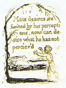 In Blake's ironic treatment of empirical doctrines and natural religion, a key element introduced in Series b is desire; "the rational mind, merely a mechanical manipulation or "ratio" of sense experience, "shall be" transformed as spiritual enlightenment advances and we discover more than "organic perceptions" allow.[52] If it were not for desires reaching beyond the sensate, Man would be trapped in a self-imposed empiricist prison. For Blake, expanding the prison or accumulating more will not bring any respite, as only the Infinite will satisfy Man. If we could not attain the infinite, we would be in eternal despair, but because we are not, Blake reasons that we thus must be able to attain the Infinite, and as such, Man becomes Infinite himself; "Locke's principle of a reciprocal and mutually validating relationship among the mind, the sense organs, and their objects has been converted into a similarly structured reciprocity among infinite desire, its infinite object, and its infinite desirer."[65]