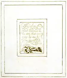 | Plate b12 (Therefore) | ![]() | Therefore God becomes as we are, that we may be as he is | Below the text, a man lies on a bed, facing outwards towards the reader. He seems to have lines of radiance emanating from his head. Several vines decorate the spaces all around the heading ("Therefore"). Another vine descends down the right margin near the third and fourth lines of text. On the left, the last letter of "may" extends into a small vine. Vines also surround the final word on the plate, "is", which is on a line on its own. | From Copy G. Although there is no way of knowing if the man is living or dead, the motif of the beams of radiance suggest he may be Christ, and thus the "God" who "becomes as/we are, that we/may be as he/is."[47][48] S. Foster Damon interprets this image as depicting an Incarnation, and the text as echoing the words of Athanasius; "He indeed assumed humanity that we might become God" (The Incarnation of the Word of God, 54). However "where the theologians all use the past tense, as of a historical event, Blake uses the present tense, for the act is eternal and is always going on."[49] Robert N. Essick believes the design perfectly reflects the text; "the Word (Blake's text) becomes the flesh (branches, leaves, etc); the flesh becomes the Word."[50] |