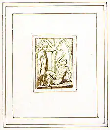 Blake himself referred to relief etching as "printing in the infernal method, by means of corrosives [...] melting apparent surfaces away, and displaying the infinite which was hid."[11] A contemporary description of the method was provided by Blake's friend, J.T. Smith; "writing his poetry, and drawing his marginal subjects of embellishments in outline upon the copper-plate with an impervious liquid, and then eating the plain parts or lights away with aquafortis considerably below them so that the outlines were left as Stereotype."[12]