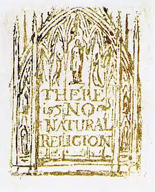 There is No Natural Religion is a series of philosophical aphorisms by William Blake, written in 1788. Following on from his initial experiments with relief etching in the non-textual The Approach of Doom (1787), All Religions are One and There is No Natural Religion represent Blake's first successful attempt to combine image and text via relief etching, and are thus the earliest of his illuminated manuscripts. As such, they serve as a significant milestone in Blake's career; as Peter Ackroyd points out, "his newly invented form now changed the nature of his expression. It had enlarged his range; with relief etching, the words inscribed like those of God upon the tables of law, Blake could acquire a new role."[1]