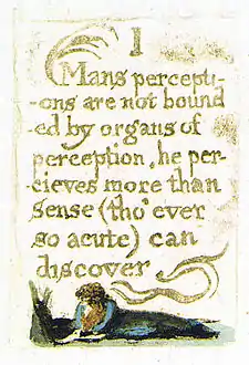 | Plate b3 (I) | ![]() | I Mans percepti- -ons are not bound -ed by organs of perception, he per- -cieves more than sense (tho' ever so acute) can discover | At the bottom of the plate, a gowned man with a beard lies on the ground, reading from a book. On the left is the stump of a tree. The first letter on the first line, "M", extends into a vine and reaches up to the heading. | From Copy G. Continuing the theme of reading from the previous plate, this picture is a mirror-image of the last one, but with subtle differences, which carry great thematic weight; "the vegetation near his head seems stunted, but the energetic scroll-like form above his body and the way the 'M' beginning the text bursts into vegetative form hint at energetic perceptions beyond the vision of this "bounded" reader."[46] Thus the 'barrier' formed by the tree in the previous plate is absent here, suggesting the possibility of the freedom of Man's spiritual faculties. |