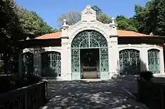 The interior is plastered and painted blue, encircled granite base and sections defined by pilasters where iron structures that support that roof are affixed, lined with wooden lathes painted in blue.[1] The main doorways are in the east, north and west preceded by three ample stairs with iron guardrail and ceramic flooring. In the centre of the building is the primitive buvette thermal spring recessed into an octagonal plan with similar pavement, and protected by iron grate, painted green (with faceted basins on angles).[1] The fountain is protected by a cylindrical bell-shaped structure. Around the building is a raised wing, accessed by an intermediary landing of stairs, with black and white ceramic floors and iron guard painted green, decorated by stylized voluptuous motifs.[1] These structures also integrate lamps on their angles into the high columns, with globe of lighting surrounded by several stylized arms (the globe lighting repeated from the ceiling).[1] A gutter runs along the lowest part of the interior with drains in the corners.[1] A centralized apparatus opens the six central rotary panels; by using a vertical iron rod, moved by a lever, allows the windows to be opened simultaneously.[1] The rooftop is a grid of horizontal rods with bearings that run north to south supporting the weight of the structure.[1]