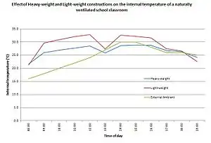 Thermal mass is effective in improving building comfort in any place that experiences these types of daily temperature fluctuations—both in winter as well as in summer. When used well and combined with passive solar design, thermal mass can play an important role in major reductions to energy use in active heating and cooling systems. The use of materials with thermal mass is most advantageous where there is a big difference in outdoor temperatures from day to night (or, where nighttime temperatures are at least 10 degrees cooler than the thermostat set point).[2] The terms heavy-weight and light-weight are often used to describe buildings with different thermal mass strategies, and affects the choice of numerical factors used in subsequent calculations to describe their thermal response to heating and cooling. In building services engineering, the use of dynamic simulation computational modelling software has allowed for the accurate calculation of the environmental performance within buildings with different constructions and for different annual climate data sets. This allows the architect or engineer to explore in detail the relationship between heavy-weight and light-weight constructions, as well as insulation levels, in reducing energy consumption for mechanical heating or cooling systems, or even removing the need for such systems altogether.