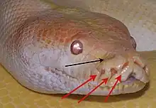 A particularly specialized form of thermoception is used by Crotalinae (pit viper) and Boidae (boa) snakes, which can effectively see the infrared radiation emitted by hot objects.[5] The snakes' face has a pair of holes, or pits, lined with temperature sensors. The sensors indirectly detect infrared radiation by its heating effect on the skin inside the pit. They can work out which part of the pit is hottest, and therefore the direction of the heat source, which could be a warm-blooded prey animal. By combining information from both pits, the snake can also estimate the distance of the object.