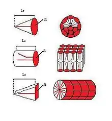 The shape of a micelle is directly dependent on the packing parameter of the surfactant. Surfactants with a packing parameter of ≤ 1/3 appear to have a cone-like shape which will pack together to form spherical micelles when in an aqueous environment (top in figure).[10][11] Surfactants with a packing parameter of 1/3 < ≤ 1/2 appear to have a wedge-like shape and will aggregate together in an aqueous environment to form cylindrical micelles (bottom in figure).[10][11] Surfactants with a packing parameter of > 1/2 appear to have a cylindrical shape and pack together to form a bilayer in an aqueous environment (middle in figure).[10][11]