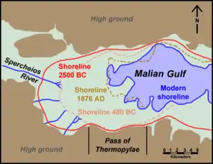 The land is dominated by the coastal floodplain of the Spercheios river and is surrounded by sloping forested limestone mountains. There is continuous deposition of sediment from the river and travertine deposits from the hot springs which has substantially altered the landscape during the past few thousand years. The land surface on which the famous Battle of Thermopylae was fought in 480 BC is now buried under 20 metres (66 ft) of soil. The shoreline has also advanced over the centuries because of the sedimentary deposition. The level of the Malian Gulf was also significantly higher during prehistoric times, and the Spercheios River was significantly shorter. Its shoreline advanced by up to 2 kilometers between 2500 BC and 480 BC but has still left several narrow passages between the sea and the mountains. The narrowest point on the plain, where the battle was probably fought, would have been less than 100 metres (330 ft) wide. Between 480 BC and the 21st century, the shoreline advanced by as much as 9 km (5.6 mi) in places, eliminating the narrowest points of the pass and considerably increasing the size of the plain around the outlet of the Spercheios.[3]
