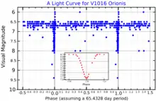 θ1 Orionis A varies in brightness, showing dips from magnitude 6.72 to 7.65 every 65.432 days. These are caused by eclipses of a close binary pair. θ1 Orionis A has been assigned the variable star designation V1016 Orionis.[2]