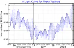 Theta Tucanae is a white A-type subgiant of spectral type A7IV with a mean apparent magnitude of +6.11, located approximately 423 light years from Earth.[12] It is classified as a Delta Scuti type variable star and its brightness varies from magnitude +6.06 to +6.15 with periods of around 70 to 80 minutes.[11][13] The Delta Scuti variables are a class of short-period (six hours at most) pulsating stars that have been used as standard candles and as subjects to study astroseismology.[9]