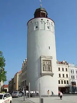 The Thick Tower (German: Dicker Turm, pronounced [dɪkɐ tʊrm]) erected in 1250 is part of the historic fortification of Görlitz. The 46-metre (151 ft) tall tower is the most massive tower in the city. Its walls in the lower part reach a thickness of 5.34 metres (17.5 ft),[1] thus the name of a thick tower. Apart from it, the Nikolai Tower and the Reichenbach Tower are still preserved. In total, Görlitz had four large watchtowers and defense towers.