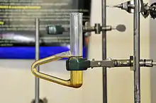 The Thiele tube, named after the German chemist Johannes Thiele, is a laboratory glassware designed to contain and heat an oil bath. Such a setup is commonly used in the determination of the melting point of a substance. The apparatus resembles a glass test tube with an attached handle.