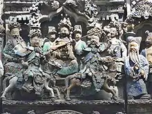 The interior of the temple is actually a partially covered courtyard, at the end of which is the altar to Mazu. The exposed portions of the courtyard contain incense burners, and open the view to the remarkable porcelain dioramas that decorate the roof. The dioramas show scenes from a 19th-century Chinese city, and include such colorful figures as actors, demons, animals, and Persian and European sailors and traders. In one scene, actors depict a duel on horseback battle between the revered halberd-wielding general Guan Yu of the novel Three Kingdoms and another fighter. Another scene depicts the three Taoist Immortal Sages representing longevity, fecundity and prosperity.