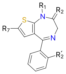 The thienodiazepine structure forms the central core of some pharmaceutical and recreational drugs, including: