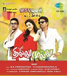 Yuvan Shankar Raja and M. S. Viswanathan, the composer of the original Thillu Mullu joined hands for the first time in Thillu Mullu and handled the music for the cult film's remake together.[6] Two songs from the original — ‘Thillu Mullu’ (remix) and ‘Ragangal Pathinaaru’ — have been retained, and two fresh songs composed. About the remix, Yuvan said, "I just wanted to give the original theme music a contemporary sound. I have not touched the song ‘Ragangal Pathinaaru’, which has been sung by singer Karthik."[13] While M. S. Viswanathan composed the tunes, Yuvan Shankar Raja orchestrated and recorded them.[9] The audio launch was held on 1 June at the Victoria Hall in Geneva, Switzerland along with the audios of Nalanum Nandhiniyum and Sutta Kadhai.[19]