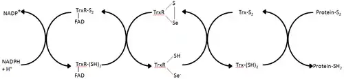 - Zhong L, Arnér ES, Holmgren A (May 2000). "Structure and mechanism of mammalian thioredoxin reductase: the active site is a redox-active selenolthiol/selenenylsulfide formed from the conserved cysteine-selenocysteine sequence". Proceedings of the National Academy of Sciences of the United States of America. 97 (11): 5854–9. Bibcode:2000PNAS...97.5854Z. doi:10.1073/pnas.100114897. PMC 18523. PMID 10801974.