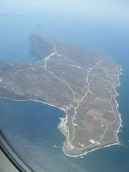 At Knossos, in a LMIIIA context (14th century BC), seven Linear B texts while calling upon "all the gods" make sure to grant primacy to an elsewhere-unattested entity called qe-ra-si-ja and, once, qe-ra-si-jo. However this probably refers to a god or a person rather than to an island *Qherasia > Therasia.[1] Anciently, the island of Therasia possessed a town of the same name.[2]