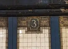 The mosaic trim on the station's track walls are predominantly tan and buff, with the numeral "3" shown in slightly cruciform-shaped friezes with a slate blue background appearing at regular intervals. Clusters of small blue diamonds set in dark blue sit on either side of these plaques. A crossover exists via the mezzanine, and a closed crossunder is located at the center of the platforms. A high ceiling is found in the station and the northbound platform has an old tower at the south end.