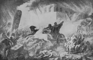 Before Christ visits these people there is a giant storm, a tremendous earthquake, and darkness. Cities burn, cities sink into the sea, mountains are brought down and valleys brought up. There is sharp lightning, wind, and thunderings and many people die. After the great storm comes darkness and the voices of mourning for the dead. The darkness lasts for approximately three days, during which a voice is "heard among all the inhabitants of the earth, upon all the face of this land, crying: Wo, wo, wo unto this people; wo unto the inhabitants of the whole earth except that they shall repent; for the devil laugheth, and his angels rejoice, because of the slain fair sons and daughters of my people; and it is because of their iniquities and abominations that they are fallen!" (3 Nephi 9:1-2) The voice then lists cities "and the inhabitants thereof" he had destroyed because of their wickedness: Zarahemla (3 Nephi 9:3), Moroni (9:4), Moronihah (9:5), Gilgal (9:6), Onihah, Mocum, and Jerusalem (the New World city founded by the Lamanites, Amelekites, and Amulonites,[6] not Jerusalem in Judaea) (9:7), Gadiandi, Gadiomnah, Jacob, and Gimgimno (9:8), Jacobugath (9:9), Laman, Josh, Gad, and Kishkumen (9:10), since "there were none righteous among them" (9:11). He asks, "O all ye that are spared because you were more righteous than they, will ye not now return unto me, and repent of your sins, and be converted, that I may heal you?" (9:13) "Yea, verily, I say unto you, if ye shall come unto me, ye shall have eternal life. Behold, my arm of mercy is extended towards you, and whosoever will come, him will I receive, and blessed are those that come unto me." (9:14) "Behold, I am Jesus Christ, the Son of God. I created the heavens and the earth, and all things that in them are. I was with the Father from the beginning. I am in the Father, and the Father in me; and in me hath the Father glorified his name." (9:15)