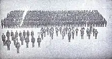Russell eventually prevailed on the federal authorities to swap the artillery battery for a black infantry battalion.[8] On April 27, 1898, he announced the creation of the battalion and placed it under the command of James H. Young, a prominent black political ally of the governor, who was given the rank of major.[9] Black newspapers across the country praised Russell for the unit's creation, in particular highlighting his decision to place it under the charge of a black officer. The unit was given the nickname "Russell's Black Battalion". Meanwhile, Harris encouraged the governor to increase the unit to regiment strength, telling him that McKinley and Secretary of War Russell A. Alger wanted North Carolina to muster a full black regiment but would "not say so officially".[8] Harris further warned him that his failure to do so would cost him political support.[10] Thus advised, when McKinley re-appealed to the American public for volunteers in May, Russell announced that he was transforming the battalion into a regiment.[8]