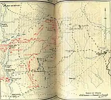 The Ottoman front line had been strengthened after the Second Transjordan attack. It began in the south, where Ottoman cavalry guarded tracks to Madaba before continuing with strongly wired entrenchments. In front of these, advanced posts extended from the foothills opposite the ford across the Jordan River at Makhadet Hijla to about 4 miles (6.4 km) north of the Jericho to Es Salt road. The road had been cut at the Ghorianyeh Bridge before the First Transjordan attack, in the vicinity of Shunet Nimrin. The front line was strengthened by advanced posts which were also wired on the left flank at Qabr Said, Kh. el Kufrein and Qabr Mujahid. From their right flank in the foothills a wired line of redoubts and trenches facing south ran from 8,000 yards (7,300 m) north of Shunet Nimrin, across the Jordan Valley to the Jordan River, 1,000 yards (910 m) south of the Umm esh Shert ford.[12][13][14] This line was continued west of the river by a series of individual "wired-in redoubts with good fields of fire,"[15] then as a series of trenches and redoubts along the northern or left bank of the Wadi Mellaha. These were followed by a "series of trenches and redoubts towards Bakr Ridge which were entrenched but not wired. A strong advanced position of well built sangars and [sic] [which were] wired in was held at Baghalat."[13] Bakr Ridge in the Judean Hills was situated to the west of the salient at El Musallabe which was held by the EEF. The Ottoman front line was supported by entrenched positions on Red Hill beside the Jordan River, which was also the site of their main artillery observation point.[12][13][14]