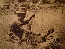 Part of the 16th Division also attacked the 3rd Brigade in No.1 Section from Lone Pine southwards. They advanced in two waves through a field of wheat, but only three men survived the Australian fire to reach the 10th Battalion's trench, and were then shot on the parapet. Turkish wounded and survivors could be seen moving back to a gully, but in the growing light they were in full view of an 11th Battalion machine-gun, which caused devastation amongst their ranks. The Australians continued firing at targets until around noon, but it was obvious the assault by the 16th Division had failed here.[39] In the extreme south of the ANZAC beachhead the 9th Battalion trench was attacked by the independent 77th Infantry Regiment. However, here as elsewhere, the attacking Turks were whittled down by the Australian fire, the last of them as they reached the belt of barbed wire in front of the Australian trenches.[40]