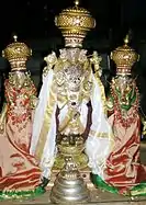 Thirukkadigai is revered in Naalayira Divya Prabhandam, the 7th–9th century Vaishnava canon, by Peyalvar and Thirumangai Alvar. The temple is classified as a Divya Desam, one of the 108 Vishnu temples that are mentioned in the book.[8] Peyalvar describes the place as the one having gardens thronged by a swam by bees.[9] The temple also finds mention in later works by Nathamuni, Thirukachi Nambi, Ramanuja, and Manavala Mamunigal. The temple is believed to be one of the 74 seats established by Ramanuja to spread Vishishtadvaita.[10] During the 18th and 19th centuries, the temple finds mention in several works like 108 Tirupathi Anthathi by Divya Kavi Pillai Perumal Aiyangar.[11] Doddacharya was a Vaishnava saint believed to be the descendant of Mudaliandan. Doddacharya followed the steps of Ramanuja in advocating Vishishadvaita and maintained the temples hailed by the Alvars. He is believed to have performed lot of miracles and impressed by his work, Achyuta Deva Raya (1529-42 CE), the relative of Krishnadevaraya gave him benovelent donations for maintenance of temples. During festival occasion in the temple like Brahmostavam, Doddacharya is given a special place in processions and also during the Garuda Sevai in Kanchipuram temple. A festival named Doddacharya Utsavam is celebrated during the Tamil month of Masi (February - March). His descendants are believed to administer the religious activities during modern times.[6] The temple is frequented by people with mental illness, who are believed to get cured by the grace of the presiding deity.[12]