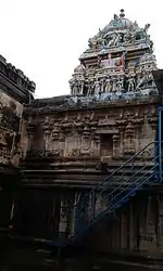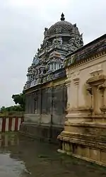 Thirunagari is the birthplace of Thirumangai Alvar. The Vedarajan temple has a 7-tier rajagopuram and an elevated structure. Unlike other temples where the temple tree (kodimaram) faces the main deity, the flagstaff here faces the shrine of Thirumangai Alvar. Vedarajan temple covers an area of about 2 acres (0.81 hectares) and has a seven-tiered gopuram (gateway tower) raising to a height of 125 ft (38 m). The temple in enclosed in a rectangular enclosure with huge granite walls. The sanctum is approached through a second gateway tower. There are a series of pillared structure around the basement of the first enclosure. The central shrine has an elevated structure and houses the image of the presiding deity, Vedarajan. The image is made of granite is sported in sitting posture. The festival deity is named Kalyana Ranganathar and the image is also housed in the sanctum. The vimana, the shrine over the sanctum is Ashtanga in architecture, which has eight parts. The outer parts of the vimana have stucco images of sages, the Dashavatara, Lakshmi Narasimha, Lakshmi Narayana and the other avatars of Vishnu. A north facing shrine of Thirumangai Alvar is located in the same elevated enclosure.[7] There is a separate flag staff for the Alvar shrine. It is believed that the two images of Narasimhar in the temple are among the five original images of Narasimha worshipped by Thirumangai Alvar. There is a small image of Chindanaikiniyan, which is also believed to have been worshipped by the Alvar. The shrine of Amruthavalli is located in the basement, in the diagonal corner of the first enclosure.[3]