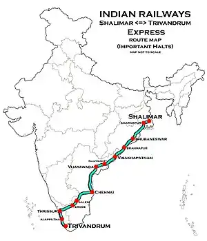 The 22641 / 42 runs from Thiruvananthapuram Central via Kollam Junction, Alappuzha, Ernakulam Junction, Thrissur, Palakkad Junction, Coimbatore Junction, Perambur, Vijayawada Junction, Visakhapatnam, Bhubaneswar, Kharagpur Junction to Shalimar.[4]