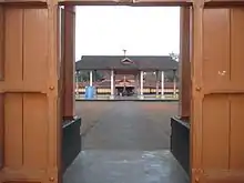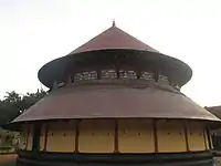 The temple is built in Kerala style architecture, which is common in all temples in the South Indian state of Kerala in Eastern axis. The temple has a two storeyed gopuram or a gateway tower, with the upper story having wooden trails covering the Kottupura (a hall of drum beating during festivals). A rectangular wall around the temple, called Kshetra-Madilluka pierced by the gateways, encloses all the shrines of the temple. The metal plated flagpost or dvajasthambam is located axial to the temple tower leading to the central sanctum and there is a Deepastamba, which is the light post. Chuttuambalam is the outer pavilion within the temple walls. The central shrine and the associated hall is located in a rectangular structure called Nallambalam, which has pillared halls and corridors.[5] Between the entrance of Nallambalam to the sanctum, there is a raised square platform called Namaskara Mandapa which has a pyramidal roof. Thevrapura, the kitchen used to cook offering to the deity is located on the left of Namaskara Mandapa from the entrance. Balithara is an altar is used for making ritualistic offering to demi-gods and the festive deities. The central shrine called Sreekovil houses the image of the presiding deity. It is on an elevated platform with a single door reached through a flight of five steps. Either sides of the doors have images of guardian deities called dvarapalakas. As per Kerala rituals, only the main priest called Thantri and the second priest called Melshanthi alone can enter the Sree Kovil.[6] The central shrine has a circular plan with the base built of granite, superstructure built of laterite and conical roof made of terracata tile supported from inside by a wooden structure. The lower half of Sree Kovil consists of the basement, the pillar or the wall, called stambha or bhithi and the entablature called prasthara in the ratio 1:2:1, in height. Similarly the upper half is divided into the neck called griva, the roof tower called shikhara and the conical kalasam (made of copper) in the same ratio. The roof projects in two levels to protect the inner structure from heavy rains during monsoon. The roof of the temple and some of the pillars have lavish wood and stucco carvings depicting various stories of ancient epics, Ramayana and Mahabharata.[7] The outer walls around the sanctum have a series of wooden frames housing an array of lamps, which are lit during festive occasions.[8] The temples have paintings on its walls dating back to early 18 century.[9]