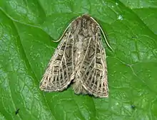 The wingspan is 38–48 mm. Forewing olive fuscous tinged with purple;all the veins white; inner and outer lines double, black; submarginal whitish, preceded by black wedgeshaped spots; claviform stigma of the ground colour outlined with whitish and black and with a pale linear centre; upper stigmata white-ringed with olive centres, reniform with a curved pale line at centre; wing in male dull white with fuscous termen, in female wholly fuscous with base alone paler; — ab. hilaris Stgr. is smaller and paler, the hindwing of male whitish.[1]