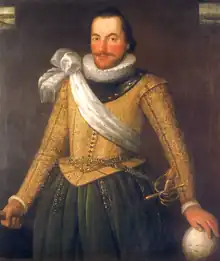 On his return, he was appointed Admiral of the Irish Coasts in command of the Irish Squadron and on 30 August 1616 was knighted by the Lord Deputy of Ireland.[6] The activity of pirates and smugglers at Pwllheli in the Cardigan Bay occupied the subject in 1631.[7] Despite his standing in the Navy, his subsequent career was marked by prolonged quarrels with the Admiralty, wrongs being committed on both sides, resulting in the end with him in ill-health being stripped of his post as Admiral and left effectively bankrupt. He was buried on 8 April 1634 at the church of St Margaret's, Westminster, survived by his wife and five of their seven children. He left no will and his Welsh lands passed to his eldest son, Miles, who had to mortgage them to meet his father's debts. After waiting three years, his widow received 650 pounds (equivalent to about 98,000 pounds in 2015) from the government in settlement of pay and expenses he was owed.[3]