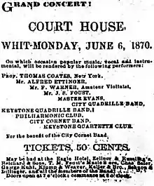 Returning to his post as conductor of Pomp's Cornet Band, Coates took his ensemble to Boston in 1864 for a performance with Gilmore's band. He continued to conduct and concertize over the ensuing decades, and became increasingly renowned for his compositions for band and orchestra. In 1876, The Times of Philadelphia described him as "the leading musical band instructor in the Lehigh valley for many years,[13] his string band performed for a Hop hosted by a local militia unit, the Easton Grays, and he also wrote several new compositions expressly for the Rough & Ready Band in August of that same year."[14][15]