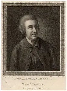 Thomas Davies (c. 1713 – 1785) was a Scottish bookseller and author. He studied at the University of Edinburgh and was for some years on the stage; but having been ridiculed by Churchill in The Rosciad he gave up acting and opened a bookshop in Covent Garden. It was here that in 1763 he introduced Boswell to Dr. Johnson, who was his close friend and to whom he dedicated his edition of the works of Massinger. He wrote a successful Life of Garrick (1780), which passed through four editions, and Dramatic Miscellanies (three volumes, 1783–4).