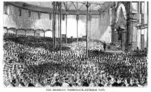 Attending Talmage's sermons became one of the most popular religious experiences of the era. In 1870, the congregation built a tabernacle solely to accommodate the large crowds who attended his church services.[4] The building was built over an old church structure then being used as a Sunday School. The demand for his sermons helped with the raising of funds, and construction was completed in only three months. Although the tabernacle had been built to seat large crowds, seating was free of charge and hundreds were turned away every Sunday.[3]
