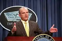In 2003, White refused to publicly rebuke General Eric Shinseki for his statement to the Senate Armed services committee that it would take "something in the order of several hundred thousand soldiers" to occupy Iraq after invasion. This, combined with White's actions on the Crusader, disagreements with Rumsfeld on the Stryker project, and his distracting association with Enron including the selling of restricted Enron stock through "private investments" (derivatives), prompted Rumsfeld to demand White's resignation. White resigned on April 25, 2003.[2][3][4]