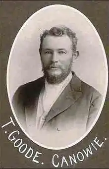 Thomas Goode was born at Pigeon House farm, Kyre Magna, near Tenbury, Worcestershire, a son of William and Catherine Goode. From the age of 14 he managed his father's farms, and for two years at Felton Court, the home of his uncle Matthew Goode, who was a successful breeder of Hereford cattle,[1] then left for South Australia on the Hope with brothers Henry Abel Goode (1838 – 12 February 1921), William (ca.1840 – 28 January 1910) and Benjamin Powell Goode (ca.1841), arriving at Port Adelaide on 19 February 1858.[2] William, Henry and Benjamin Goode ran a shop at Yankalilla[3] Charles Rufus Goode (1844–1913) came out in 1860,[4] Another brother, Matthew (1847–1831) arrived on the South Australian in 1868.