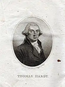 Thomas Hardy was born on 3 March 1752 in Larbert, Stirlingshire, Scotland, the son of a merchant seaman.[1] His father died in 1760 at sea while Thomas was still a boy. He was sent to school by his maternal grandfather[1] and later apprenticed to a shoemaker in Stirlingshire. He later worked in the Carron Iron Works. As a young man, arrived in London just before the American Revolutionary War. On 21 May 1781 he was married at St-Martin-in-the-Fields church to Lydia Priest, the youngest daughter of a carpenter and builder from Chesham, Buckinghamshire. The couple had six children, all of whom died in infancy. Lydia died in childbirth on 27 August 1794, her child (the sixth) being stillborn: the cause may have been the injuries she had sustained when a loyalist "Church and King" mob attacked the Hardy home some weeks earlier.[2] In 1791, Hardy opened his own boot and shoe shop at 9 Piccadilly, London.[1]