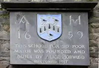 - "This almshous was founded and endowed by the worshjpful Thomas Horwood, Merchant, twice mayor of this towne who was a worthy benefactor, and began it in his life, finished by his wife, Mrs Alice Horwood, after his death who of her owne accord added the adioyning free schoole and endowed it for 20 poore children for ever. 1659. Abi et tu fac similiter" (i.e. "go ye and do likewise")