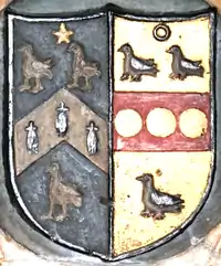 He married a certain Alice, whose family is unknown, but whose paternal arms as shown on her husband's mural monument in St Peter's Church, Barnstaple were: Or, on a fesse between three martlets gules as many bezants an annulet for difference.[3] In 1659, early in her widowhood, she founded a free school for "twenty poor maids", in Church Lane, Barnstaple, next to her husband's almshouse and today in use as a coffee-shop. A slate tablet affixed in 1917 above the entrance door of Alice Horwood's School, now the "Old School Coffee Shop" in Church Lane, Barnstaple, is inscribed: "A.H. 1659. This school for 20 poor maids was founded and built by Alice Horwood. Restored 1917", and shows the arms of Horwood: Azure, a chevron ermine between three moorcocks passant argent winged sable wattled gules in chief a mullet argent for difference. Adjoining Thomas Horwood's almshouse are "Paige's Almshouses", founded by his sister Elizabeth Horwood (Mrs Paige), sister-in-law of Gilbert I Paige (d.1647), twice Mayor of Barnstaple in 1629 and 1641.