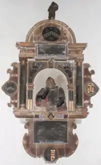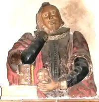 His mural monument which survives in St Peter's Church, Barnstaple, shows an effigy of the deceased seated under an arch, his right elbow propping up his head and his left hand holding a human skull, in the vanitas genre. In the spandrels of the arch are depicted female personifications of Prudentia (left) with her attributes of mirror and snake, and Justitia (right) with her balance and sword. It includes two tablets, the higher of which is inscribed as follows: